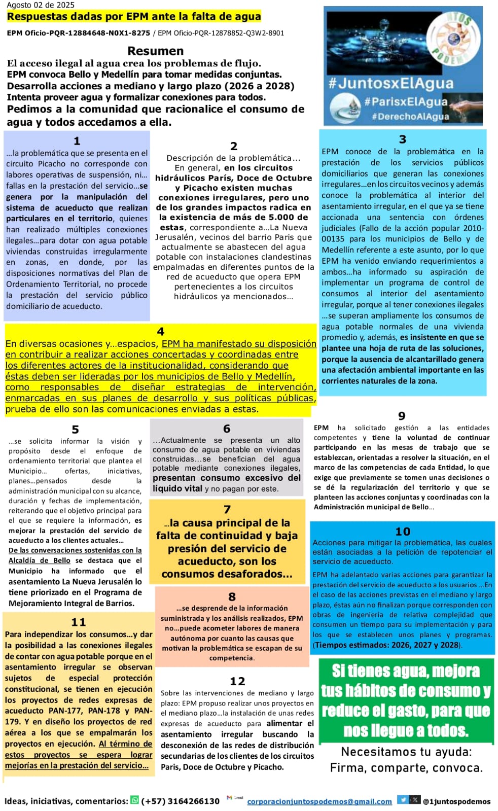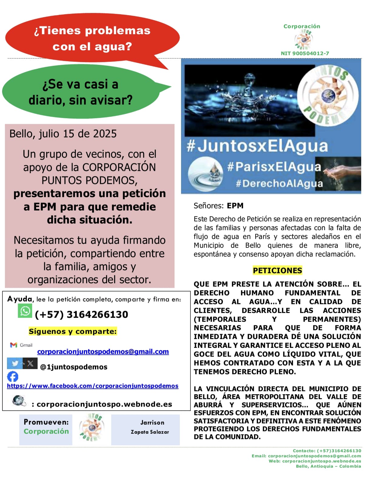 Promovemos y apoyamos la iniciativa de la comunidad de París en pro de obtener la garantía por parte de EPM en el acceso y goce de ésta.
